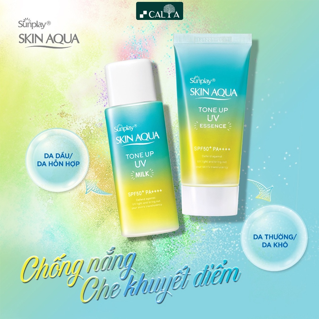 Sữa Chống Nắng Sunplay Mint Green Nâng Tone Cho Da Dầu, Dưỡng Trắng Da - Sunplay Skin Aqua Tone Up UV SPF50+ PA++++ 50g - Xuất xứ thương hiệu: Nhật Bản - Sản xuất tại Việt Nam - Thương hiệu: Sunplay 💕 Là một trong những thương hiệu của Rohto có xuất xứ tại Nhật Bản. Skin Aqua nổi tiếng với những dòng kem chống nắng được nhiều khách hàng ngày nay tin dùng và sử dụng. 💕 Sản phẩm được bình chọn #1 Kem chống nắng tốt nhất năm 2018 bởi Cosme (trang thông tin mỹ phẩm hàng đầu Nhật Bản), vừa có tác dụng chống nắng vừa giúp hiệu chỉnh sắc da sáng hồng. 💕 THÀNH PHẦN - Hyaluronic Acid, Vitamin C, Pearl Powder, Octinoxate, Uvinul A plus & tinosorb S, Titanium dioxide.... 💕 CÔNG DỤNG - SPF50+: ngăn tia UVB (ngăn chặn các hiện tượng rát da, cháy nắng,…) - PA++++: tăng cường chống mọi loại tia UVA (giúp bảo vệ da, ngăn chặn đen sạm, nám, tàn nhang, nếp nhăn, đốm nâu,…) - Đặc biệt, với công thức độc đáo, Sunplay Skin Aqua Tone Up UV Essence sẽ hiệu chỉnh sắc da giúp che phủ tự nhiên, nâng tông da sáng hồng, tràn đầy sức sống cho những làn da bị hư tổn. - Và cùng với các hạt ngọc trai siêu mịn phản chiếu ánh sáng đa chiều, sản phẩm sẽ tạo hiệu ứng trong suốt 3D, giúp da trở nên trong suốt và rạng rỡ hơn bao giờ hết. - Sunplay Skin Aqua Tone Up UV còn giúp giữ ẩm và dưỡng sáng da nhờ các thành phần dưỡng ẩm tối ưu Hyaluronic Acid, cùng với sự kết hợp của Vitamin C. Sản phẩm sẽ giúp tăng cường độ ẩm, giúp da luôn mềm mại, mịn màng và dưỡng da sáng mịn, trắng hồng tự nhiên. - Sản phẩm với dạng tinh chất, kết cấu mỏng nhẹ, thấm nhanh, không gây bết dính cho da và đặc biệt phù hợp với điều kiện khí hậu tại Việt Nam. - Sản phẩm không chứa cồn, không chứa chất bảo quản, phù hợp với mọi loại da, kể cả những làn da nhạy cảm. Có thể dùng làm lớp lót trang điểm. 💕 PHÂN LOẠI SẢN PHẨM - Bản Milk: Phù hợp cho da dầu - Bản Essence: Phù hợp cho da thường và da khô 💕 HƯỚNG DẪN SỬ DỤNG - Thoa đều sản phẩm trước trước khi ra ngoài 20 - 30 phút. Lưu ý tránh thoa vào vùng da bị trầy xước, vết thương hở. Dặm lại sau 2-3 tiếng... 💕 Hạn sử dụng: 3 năm kể từ ngày sản xuất