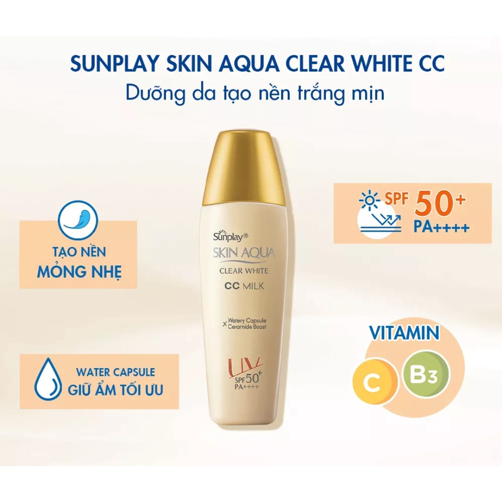 Sữa chống nắng tạo nền Sunplay Skin Aqua Clear White CC Milk 25g - Bảo vệ da hiệu quả khỏi tác hại của tia UV, tránh nguy cơ ung thư da: PA++++ tăng cường chống mọi loại tia UV (gây đen sạm, nám, tàn nhang, nếp nhăn, đốm nâu,…), SPF50+ ngăn tia UVB (gây rát da, cháy