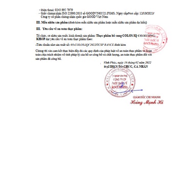 SỮA DINH DƯỠNG COLOS IQ CƠ-XƯƠNG-KHỚP 900G ♻️ ♻️ ♻️THÀNH PHẦN CẤU TẠO ✔️Sữa bột béo, Đạm Whey cô đặc, Đường (maltodextrin, lactose, dextrose) ✔️Chất béo không no (MCT, PUFA, MUFA), Chất xơ hòa tan (FOS), Sữa non (IgG), NEOGOS P70, Choline, Beta-glucan, Taurine, Lysine, Glucosamin sulfat natri, Collagen type, HMB, Inositol. ✔️Chiết xuất tổ yến, Bột macca, Bột óc chó, Enzym tiêu hóa (Protease, Amylase, Cellulase, Lipase, lactase), Lactobacillus acidophilus (Probiotic). ✔️Các Vitamin (Vitamin a, Vitamin B2, Biotin, Vitamin C, Vitamin E, Vitamin B12, Vitamin D3, Vitamin D3, Vitamin B1, Vitamin B6, Vitamin K2 (MK7), Vitamin B5, Vitamin B3, Axit folic) ✔️Khoáng chất (Canxi Carbonate, Canxi nano, Aquamin F (Canxi từ tảo biển), Sắt III polymaltose, Kali Iodua, Natri selenit, Crom Clorid, Kẽm Gluconate, Đồng Sulphat, mangan sulphat, Magie Phosphat, natri clorid) ✔️Hương sữa và hương vani tổng hợp dùng trong thực phẩm. ✔️Nguyên liệu sữa bột nhập khẩu từ New Zealand ♻️ ♻️ ♻️CÔNG DỤNG ✔️Tăng cường sức đề kháng ✔️Giúp cải thiện chức năng xương khớp ✔️Giúp xương chắc, khớp khỏe, ngăn ngừa loãng xương ♻️ ♻️ ♻️ĐỐI TƯỢNG SỬ DỤNG ✔️Người từ 15 tuổi trở lên ✔️Người muốn phát triển chiều cao ✔️Người cần bổ sung canxi. ✔️Người thoái hóa xương khớp, người có nguy cơ loãng xương. ✔️Không thích hợp cho đối tượng không dung nạp sữa bò, dị ứng với Lactose ♻️ ♻️ ♻️ HƯỚNG DẪN CÁCH PHA ✔️ Pha ở nơi sạch sẽ. Rửa tay và dụng cụ pha thật sạch sẽ, đun sôi dụng cụ pha trong 5 phút. ✔️Đun sôi nước sạch trong 5 phút, để nguội dần xuống 40 độ C trước khi pha. ✔️ Pha theo bảng hướng dẫn và sử dụng muỗng lường có sẵn trong lon. ✔️Đậy nắp, lắc đều dụng cụ để tan hoàn toàn. Thận trọng: Pha xong dùng ngay. Hỗn hợp sau khi pha sử dụng hết trong vòng 1 giờ. Đổ bỏ phần thừa sau mỗi lần uống ♻️ ♻️ ♻️ BẢO QUẢN Bảo quản sản phẩm ở nơi khô ráo, thoáng mát, tránh ánh nắng trực tiếp. Không bảo quản sản phẩm trong tủ lạnh. ♻️ ♻️ ♻️ HẠN SỬ DỤNG 30 tháng kể từ ngày sản xuất. Ngày sản xuất và hạn dùng in trên vỏ hộp. Không sử dụng quá 4 tuần kể từ ngày mở nắp hộp. NƠI SẢN XUẤT : VIỆT NAM HẠN SỬ DỤNG : 30 THÁNG ♻️ ♻️ ♻️ Shop CAM KẾT 👍 Sản phẩm 100% giống như mô tả và hình ảnh 👍 Tư vấn hỗ trợ khách hàng nhiệt tình, chu đáo 👍 Thời gian chuẩn bị hàng tối ưu nhất 👍 Mua đúng sản phẩm , nói KHÔNG với hàng nhái 👍 Được phép khui hàng xem hàng thoải mái,test mã cod mới thanh toán tiền sau. 👍 Giao hàng nhanh chóng từ 1-4 ngày. 👍 Đổi trả hàng theo đúng quy định của Shopee. 👍 Khách hàng cần hỗ trợ tư vấn thì liên hệ shop: 0976…777…310 "Sản phẩm không phải là thuốc và không có tác dụng thay thế thuốc chữa bênh"