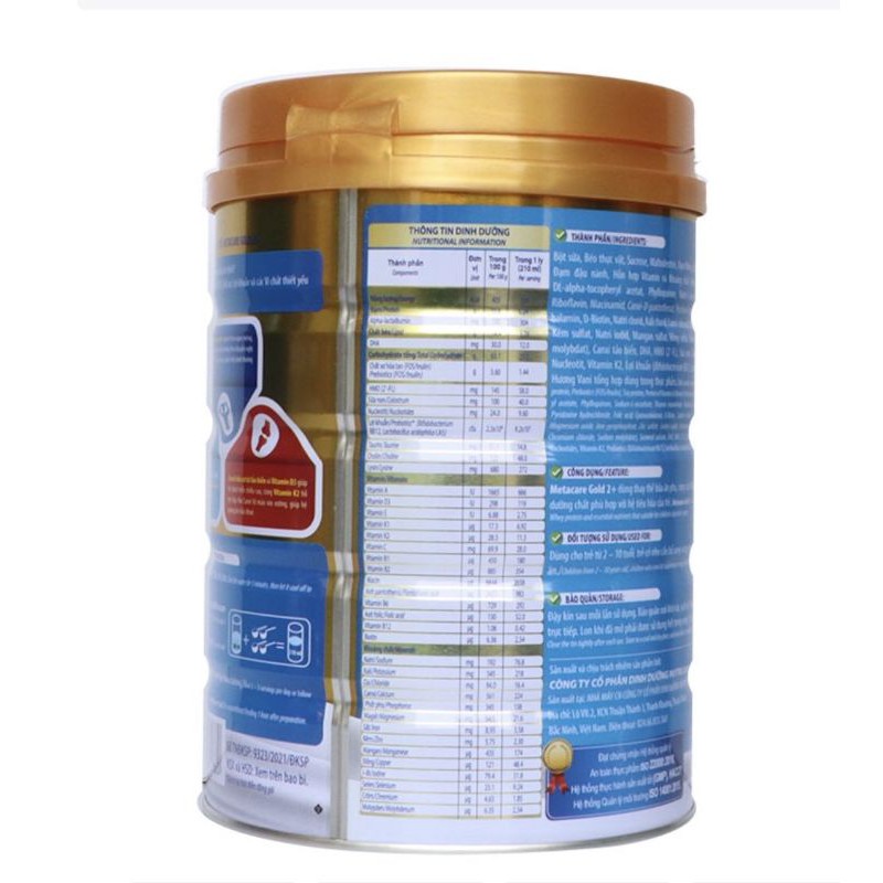 Sữa MetaCare Gold là dòng cải tiến từ sản phẩm Meta Care với rất nhiều ưu điểm vượt trội giúp bé tiêu hóa khỏe, tăng hấp thu Meta Care Gold mới được chia làm 3 số dành cho 3 độ tuổi khác nhau: Meta Care Gold 0+ dành cho trẻ từ 0-12 tháng Meta Care Gold 1+ dành cho trẻ từ 1-2 tuổi Meta Care Gold 2+ dành cho trẻ từ 2-10 tuổi. Sữa Meta Care Gold Cộng dụng của sản phẩm MetaCare Gold Sản phẩm Meta Care Gold trọng tâm vào hỗ trợ tăng cường sức khỏe cho hệ tiêu hóa từ đó giúp cho cơ thể trẻ hấp thu dinh dưỡng tối ưu để phát triển toàn diện: – Tăng cân: Năng lượng cao cùng đạm Whey dễ hấp thu – Tốt cho não bộ và thị giác: DHA, Choline phát triển trí não, cùng Axit Folic tăng khả năng ghi nhớ, học hỏi. – Phát triển hệ xương, tăng chiều cao: Canxi hữu cơ từ tảo biển, Vitamin D3, Vitamin K2. – Tăng cường sức đề kháng: Hàm lượng cao sữa non, Kẽm và hệ Antioxidant (A, C, E và Selen) – Tiêu hóa khỏe, hấp thu tốt: Đạm Whey giàu Alpha-lactalbumin dễ hấp thu, HMO (2’FL), Chất xơ (FOS/Inulin) từ rau diếp xoan và lợi khuẩn ngăn ngừa táo bón, cùng Nucleotides và tinh chất Olive hỗ trợ tiêu hóa khỏe mạnh, giúp tăng cường hấp thu dưỡng chất. – Cải thiện biếng ăn: Kẽm, Lysine tăng cảm giác ngon miệng – Dinh dưỡng đầy đủ theo khuyến nghị của bộ Y tế, đảm bảo sự phát triển toàn diện của trẻ. Sữa Metacare Gold Hướng dẫn sử dụng sữa Meta Care Gold Sữa MetaCare Gold là dòng sản phẩm cao cấp của Nutricare có chứa nhiều dưỡng chất quý nên sử dụng đúng cách sẽ giúp bé hấp thu tối đa để tăng trưởng và phát triển tốt. – Trước khi pha sữa MetaCare Gold mẹ cần phải rửa tay sạch với xà phòng và nước trước khi pha. – Đun các dụng cụ pha, cốc và nắp trong nước sôi 2 phút để tiệt trùng. – Đun sôi nước để pha trong khoảng 1 phút sau đó đển nguội xuống còn khoảng 40-50 độ C. – Cho đúng lượng nước vào cốc hoặc bình rồi cho từ từ sữa MetaCare Gold vào theo hướng dẫn theo độ tuổi trên hộp sữa: 40 gam bột (4 muỗng gạt) + 180 ml nước chín ấm. Ngày uống từ 2-3 ly tùy thuộc vào nhu chế độ ăn của bé – Lắc hoặc khuấy đều cho đến khi tan hết, thử độ nóng và cho bé dùng. Đổ bỏ phần sữa đã pha khi dùng thừa, sử dụng sữa đã pha trong vòng 1 giờ Bảo quản: Nơi khô ráo, sạch sẽ, thoáng mát, tránh ánh nắng trực tiếp. Hộp đã mở phải được đậy kỹ và sử dụng hết trong vòng 3 tuần. Nutricare chứng nhận chính hãng Sản phẩm đạt chứng nhận hệ thống quản lý An toàn thực phẩm ISO 22000:2005. Hệ thống thực hành sản xuất tốt HACCP số TNĐKSP của Bộ Y Tế Thương nhân chịu trách nhiệm: Công ty TNHH Dinh Dưỡng Nutricare Đại lý bán lẻ chính hãng THÔNG TIN THƯƠNG HIỆU Logo NutricareNutricare tự hào là Thương hiệu Quốc Gia về Thực phẩm Dinh dưỡng Y học. Với đội ngũ Nutricare luôn cố gắng mang đến những sản phẩm dinh dưỡng an toàn tuyệt đối & thực sự chất lượng, hiệu quả cho người tiêu dùng Việt Nam. Cũng nhờ vậy, công ty liên tiếp được trao tặng hơn 15 giải thưởng & danh hiệu danh giá, góp phần khẳng định niềm tin của khách hàng dành cho thương hiệu Nutricare.