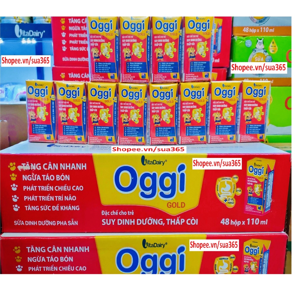 LƯU Ý: Sữa mẹ là thức ăn tốt nhất cho sức khỏe và sự phát triển toàn diện của trẻ sơ sinh và trẻ nhỏ. Sản phẩm này là thức ăn bổ sung và được ăn thêm cùng với sữa mẹ Chú ý : Sữa mẹ là thức ăn tốt nhất cho sức khỏe và sự phát triển toàn diện của trẻ nhỏ, Các yếu tố chống nhiễm khuẩn, đặc biệt là kháng thể chỉ có trong sữa mẹ có tác dụng phòng, chống bệnh tiêu chảy, nhiễm khuẩn đường hô hấp và một số bệnh nhiễm khuẩn khác. Sữa bột Pha Sẵn Oggi Gold 180ml cho Trẻ Suy Dinh Dưỡng Thấp Còi Sữa pha sẵn Oggi Gold hộp 110ml Trẻ Suy Dinh Dưỡng Thấp Còi Thương hiệu: VitaDairy Sản xuất tại: Việt Nam Trọng lượng: 1 thùng = 48 hộp 180ml Độ tuổi: 1 - 2 tuổi , 2 - 6 tuổi , > 6 tuổi Thương hiệu: VitaDairy Sản xuất tại: Việt Nam Trọng lượng: 1 thùng = 48 hộp 110ml Độ tuổi: 1 - 2 tuổi , 2 - 6 tuổi , > 6 tuổi Oggi Gold - Dinh dưỡng đặc chế cho trẻ suy dinh dưỡng thấp còi Oggi Gold là sản phẩm dùng để thay thế bữa ăn phụ , bổ sung dinh dưỡng , Vitamin và khoáng chất thiết yếu giúp trẻ Suy dinh dưỡng , thấp còi và trẻ biếng ăn phát triễn cân nặng , chiều cao và tăng cường sức khỏe tổng thể Những lợi ích dinh dưỡng vượt trội từ Oggi Gold: * Tăng cân nhanh: Dinh dưỡng cân đối, đầy đủ với tỷ lệ chất đạm, béo phù hợp, vitamin và khoáng chất thiết yếu giúp trẻ tăng cân, bổ sung thêm 2’-FL HMO, L-Lysine giúp trẻ ổn định hệ tiêu hóa và phục hồi cân nặng. * Ngừa táo bón: 2’-FL HMO kết hợp chất xơ hòa tan từ thực vật (FOS/Inulin) giúp hệ tiêu hóa khỏe mạnh và phòng ngừa táo bón. Phát triển trí não: DHA kết hợp Choline giúp trẻ phát triển trí não, thị giác. * Phát triển chiều cao: Tăng cường Canxi, Photpho, Vitamin D3 giúp phát triển chiều cao vượt bậc. * Tăng sức đề kháng: 2’FL - HMO kết hợp với Kẽm, Selen, Vitamin A, E giúp trẻ có sức đề kháng tốt, giảm bệnh vặt và phát triển khỏe mạnh. Thành phần: Tham khảo thông tin trên bao bì sản phẩm Hướng dẫn sử dụng: Không dùng cho trẻ dưới 1 tuổi Ngon hơn khi uống lạnh Lắc đều trước khi sử dụng Nên dùng 2-3 hộp mỗi ngày Hướng dẫn bảo quản: Để nơi khô ráo, thoáng mát. Tránh ánh nắng trực tiếp. Khối lượng : 1T x 48 Hộpx180ml Xuất xứ: Cty Cổ Phần Sữa Vitadairy Việt Nam