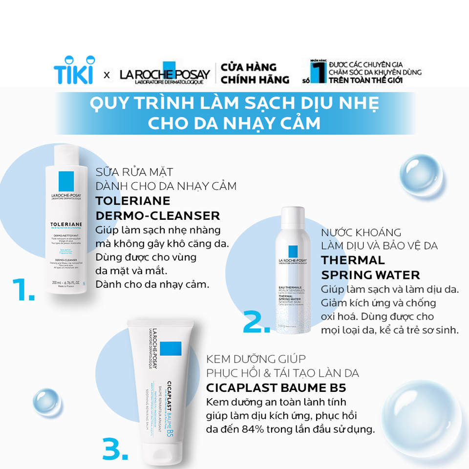 Sữa rửa mặt tẩy trang cho da quá nhạy cảm kích ứng La Roche-Posay Toleriane Dermo-Cleanser 200ml có kết cấu dạng sữa lỏng giàu Glycerin dưỡng ẩm và khả năng dung nạp cao. Sản phẩm giúp làm sạch da nhẹ nhàng, làm sạch các tạp chất và bã nhờn dư thừa, để lại làn da sạch sẽ và tươi mới với công thức tối giản an toàn cho làn da rất nhạy cảm và dễ kích ứng. THÔNG TIN SẢN PHẨM *Loại sản phẩm- Sữa rửa mặt tẩy trang dịu nhẹ cho da quá nhạy cảm & kích ứng *Loại da phù hợp- Dành riêng cho da rất nhạy cảm, dễ kích ứng *Độ an toàn- Quy tắc bào chế nghiêm ngặt để tối thiểu khả năng gây kích ứng da- Công thức sản phẩm tối giản, không chứa paraben, không sulfate, không hương liệu & không chất bảo quản *Thành phần- Giàu EDTA có khả năng trung hoà nước cứng và Glycerin giúp dưỡng ẩm- Công thức sản phẩm không chứa xà phòng giúp làm sạch da nhẹ nhàng, khả năng dung nạp cao *Công dụng- Da được làm sạch và tẩy trang hiệu quả- Cung cấp độ ẩm và chống kích ứng cho da *Hướng dẫn sử dụng1. Sử dụng hàng ngày và buổi sáng và tối2. Làm ẩm da với nước ấm, sau đó cho một lượng sản phẩm vừa đủ ra tay và tạo bọt3. Massage nhẹ nhàng khắp mặt, tránh vùng da quanh mắt4. Rửa lại với nước ấm và lau khô5. Nên sử dụng thêm nước khoáng giúp dịu, cân bằng da và hạn chế kích ứng *Hướng dẫn bảo quản- Nơi thoáng mát, tránh ánh nắng mặt trời trực tiếp HSD: 3 năm kể từ NSXNSX: Xem trên bao bìXuất xứ thương hiệu: PhápNơi sản xuất: Pháp*Hình ảnh sản phẩm có thể thay đổi theo từng đợt nhập THÔNG TIN THƯƠNG HIỆU La Roche-Posay là nhãn hàng dược mỹ phẩm đến từ Pháp trực thuộc tập đoàn L’Oreal đã hoạt động được hơn 30 năm, phối hợp nghiên cứu với các bác sĩ da liễu trên toàn thế giới cho ra đời các sản phẩm dưỡng da hướng đến thị trường sản phẩm dành cho da nhạy cảm, ngoài ra còn có dòng sản phẩm dành cho trẻ em. Thành phần nổi bật xuất hiện trong các sản phẩm của La Roche-Posay (LRP) là nước suối khoáng – thermal spring water. Tất cả những sản phẩm thuộc La Roche Posay đều được thử nghiệm lâm sàng và đánh giá khách quan từ bệnh viện Saint Jacques-Toulouse. Quy trình bào chế của sản phẩm cũng rất nghiêm ngặt mang lại cho người sử dụng vẻ đẹp tự nhiên và rất an toàn.Giá sản phẩm trên Tiki đã bao gồm thuế theo luật hiện hành. Bên cạnh đó, tuỳ vào loại sản phẩm, hình thức và địa chỉ giao hàng mà có thể phát sinh thêm chi phí khác như phí vận chuyển, phụ phí hàng cồng kềnh, thuế nhập khẩu (đối với đơn hàng giao từ nước ngoài có giá trị trên 1 triệu đồng).....