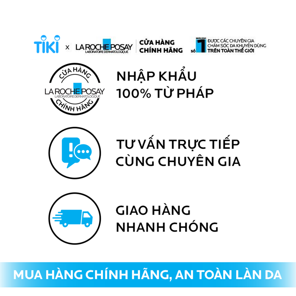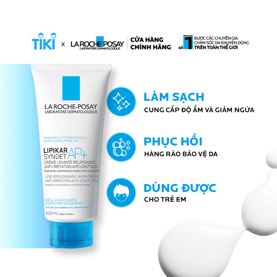 Sữa Rửa Mặt Và Tắm Cho Da Khô, Da Nhạy Cảm, Mẫn Ngứa La Roche-Posay Lipikar Syndet AP+ Cream (200ml) có công thức dịu nhẹ với thành phần dưỡng ẩm cao giúp làm dịu làn da nhạy cảm khô đến rất khô, da đang bị kích ứng, mẩn đỏ và ngứa. Sản phẩm được khuyên dùng cho da viêm cơ địa, chàm đang bùng phát, da đang bị ngứa, kích ứng & khó chịu, phù hợp cho cả trẻ em & trẻ sơ sinh. THÔNG TIN SẢN PHẨM *Loại sản phẩm: Sữa rửa mặt và tắm cho da khô, da nhạy cảm, mẫn ngứa đỏ, viêm da *Loại da phù hợp:- Da nhạy cảm, da khô đến rất khô- Da đang bị dị ứng, tróc ngứa, trầy xước- Dùng được cho trẻ em & người lớn có làn da khô- Dùng cho mặt và cơ thể *Độ an toàn:- pH 5.5 phù hợp sinh lý da- Không xà phòng, không paraben, không hương liệu *Thành phần:- Aqua Posae Filiformis: Đây là một nghiên cứu độc quyền được bằng sáng chế của La Roche-Posay. Hoạt chất hoạt động trên da giúp chống dị ứng, bảo vệ lớp hydrolipid và giảm các kích ứng trên da, giúp nuôi dưỡng và làm dịu làn da kích ứng.- Niacinamide: làm dịu da tức thì, giảm ngứa, giảm viêm và phục hồi hàng rào bảo vệ da- Bơ hạt mỡ, Glycerin: củng cố hàng rào bảo vệ da- Nước khoáng La Roche-Posay: giảm ngứa, giảm viêm và phục hồi hàng rào bảo vệ da *Công dụng:- Làm sạch, cung cấp độ ẩm và giảm ngứa- Giúp nhẹ nhàng làm sạch và phục hồi hàng rào bảo vệ da *Hiệu quả:- 38% cải thiện chất lượng cuộc sống và đã được chứng minh lâm sàng- 85% cảm nhận rằng sản phẩm giúp giảm kích ứng da *Hướng dẫn sử dụng:1. Sử dụng Lipikar Syndet AP+ 2-3 lần/ngày2. Lấy một lượng sản phẩm vừa đủ ra tay, làm ẩm, tạo bọt và thoa lên vùng da cần làm sạch3. Nhẹ nhàng mát-xa sau đó xả sạch với nước và lau khô4. Tránh tiếp xúc trực tiếp vùng mắt HSD: 3 năm kể từ NSXNSX: Xem trên bao bìXuất xứ thương hiệu: PhápNơi sản xuất: Pháp *Sẽ tùy theo từng lô hàng mà bao bì, mẫu mã và xuất xứ có thể thay đổi* THÔNG TIN THƯƠNG HIỆU La Roche-Posay là nhãn hàng dược mỹ phẩm đến từ Pháp trực thuộc tập đoàn L’Oreal đã hoạt động được hơn 30 năm, phối hợp nghiên cứu với các bác sĩ da liễu trên toàn thế giới cho ra đời các sản phẩm dưỡng da hướng đến thị trường sản phẩm dành cho da nhạy cảm, ngoài ra còn có dòng sản phẩm dành cho trẻ em. Thành phần nổi bật xuất hiện trong các sản phẩm của La Roche-Posay (LRP) là nước suối khoáng – thermal spring water. Tất cả những sản phẩm thuộc La Roche Posay đều được thử nghiệm lâm sàng và đánh giá khách quan từ bệnh viện Saint Jacques-Toulouse. Quy trình bào chế của sản phẩm cũng rất nghiêm ngặt mang lại cho người sử dụng vẻ đẹp tự nhiên và rất an toàn.Giá sản phẩm trên Tiki đã bao gồm thuế theo luật hiện hành. Bên cạnh đó, tuỳ vào loại sản phẩm, hình thức và địa chỉ giao hàng mà có thể phát sinh thêm chi phí khác như phí vận chuyển, phụ phí hàng cồng kềnh, thuế nhập khẩu (đối với đơn hàng giao từ nước ngoài có giá trị trên 1 triệu đồng).....