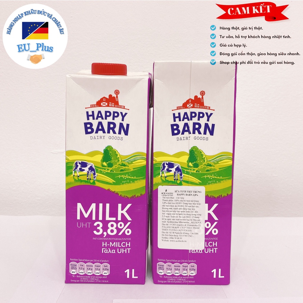 ✅Xuất xứ : Ba Lan ✅Thùng :12H mỗi hộp 1 lít 🔺 KHÔNG ĐƯỜNG 💁♀️ Sữa tươi Happy Barn 3,8% hộp 1 lít là sản phẩm dinh dưỡng tuyệt vời cho người muốn tăng cân hoặc bổ sung dưỡng chất thiết yếu hàng ngày. 💁♀️Thành phần 100% sữa bò tươi nguyên chất, nguyên kem, sữa tươi Happy Barn 3,8% cung cấp nguồn năng lượng dòi dào để bạn bắt đầu một ngày mới. 💁♀️Sản phẩm có thể uống trực tiếp hoặc cho vào nấu ăn, làm bánh tạo nên hương vị béo ngậy, thơm ngon rất hấp dẫn.