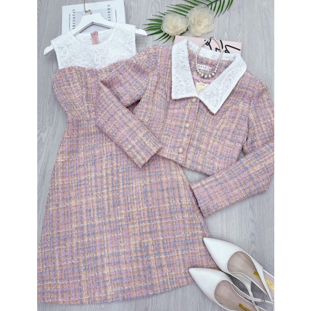 S217 Set váy dạ hồng tiểu thư váy dạ tweed cổ tròn kèm áo khoác blazer tay dài nữ tính