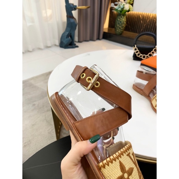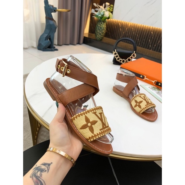 Sandal nữ Louis Vuitton LV da thật cao cấp phối quai cói mẫu mới 2021