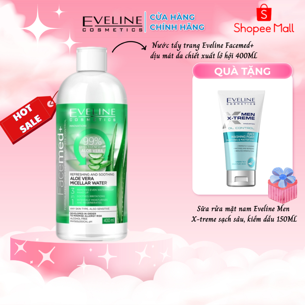 Nước tẩy trang làm dịu mát da 3 trong 1 chiết xuất Lô hội Facemed Eveline 400ml
