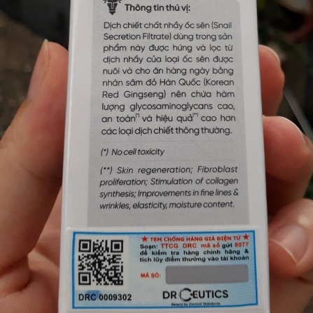 CAM KẾT CHÍNH HÃNG 100% Serum B5 DrCeutics Cấp Ẩm Và Phục Hồi Da Dexpanthenol 10% + Centella Extract + HA • Thương hiệu: Dr Ceutics • Xuất xứ: Việt Nam • Dung tích: 30ml và 100ml Serum B5 DrCeutics Cấp Ẩm Và Phục Hồi Da Dexpanthenol 10% + Centella Extract + HA là sản phẩm phù hợp với mọi loại da, đặc biệt những làn da nhạy cảm cần được phục hồi không nên bỏ qua. THÀNH PHẦN CHÍNH: - Tinh chất Rau Má: Giúp làm dịu da nhanh chóng, phục hồi các thương tổn trên da. Rau má còn có tác dụng giữ ẩm, chống oxy hóa và ngăn ngừa lão hóa da hiệu quả. Giúp da sáng khỏe mạnh - Hyaluronic Acid (HA) : Là thành phần ngậm nước tiêu biểu trong các sản phẩm làm đẹp. HA ngăn chặn hiện tượng mất nước xuyên biểu bì, từ đó giúp giữ nước trong da nhiều hơn, giúp da căng mọng và hạn chế được tình trạng khô da, bong tróc. - Provitamin B5: Có tác dụng phục hồi da mạnh mẽ, khả năng giữ ẩm cao, làm dịu và giảm đỏ da. Khi kết hợp Provitamin B5 và Acid Hyaluronic giúp làm tăng tác dụng giữ ẩm và bảo vệ da tốt hơn. - Dịch Nhầy Ốc Sên: Kích thích sản sinh các sợi Collagen và Elastin tự nhiên trong da, giúp phục hồi các hư tổn và ngăn ngừa lão hóa da. Dịch nhầy ốc sên còn có tác dụng trong việc dưỡng ẩm, bảo vệ da trước các tác động từ môi trường. Cho da căng bóng và làm sáng, đều màu da. CÔNG DỤNG: - Bổ sung độ ẩm và làm dịu da - Giảm đỏ, phục hồi da các tổn thương trên da - Thúc đẩy sản sinh Collagen và Elastin, ngăn ngừa lão hóa da - Cung cấp dưỡng chất giúp da sáng, khỏe HƯỚNG DẪN SỬ DỤNG: - Làm sạch da với sữa rửa mặt - Cho Serum B5 DrCeutics Cấp Ẩm Và Phục Hồi Da Dexpanthenol 10% + Centella Extract + HA ra tay hoặc trực tiếp lên da mặt, mát xa nhẹ nhàng và vỗ nhẹ để tinh chất thấm nhanh vào da - Có thể sử dụng ngày 2 lần sáng và tối #DrCeutics #DrCeuticsVietNam #Serum #Duongda
