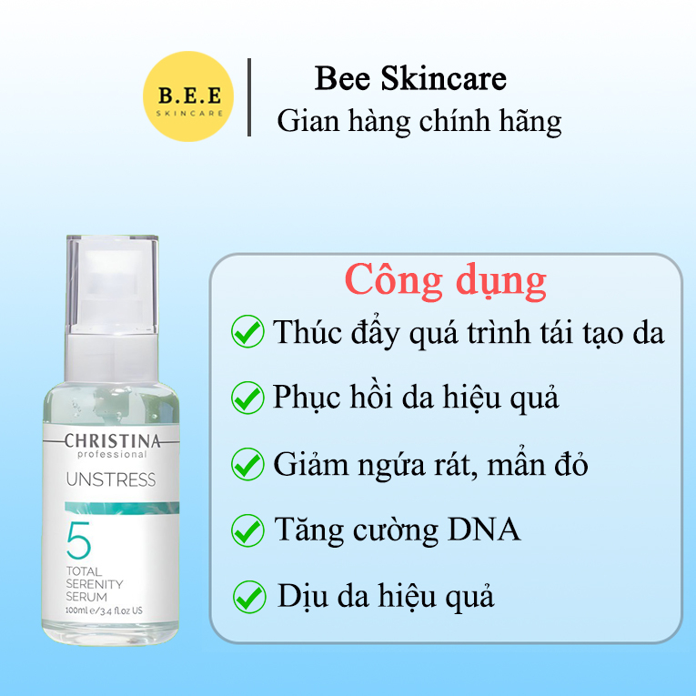 💦 Serum Christina Unstress 5 Total Serenity Cấp Ẩm, Phục Hồi Da Nhạy Cảm, Dịu Da Bee Skincare --------------------------- ✅ CÔNG DỤNG - Total Serenity Serum là sản phẩm thúc đẩy tái tạo và làm dịu da được chiết xuất từ thảo dược thiên nhiên như: Quintescine peptide,