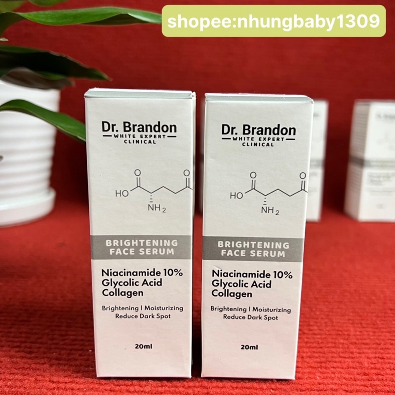❤️ chai 20ml ❤️ thiết kế hộp giấy nắp hộp dán liền Serum Dr. Brandon Niacinamide 10 % + Collagen Brightening Face Serum 20 ml Là công thức huyết thanh giúp làm sáng da đồng thời cải thiện kết cấu da . Với hoạt chất Niacinamide hoặc B3 có khả năng ngăn ngừa sự tăng sắ