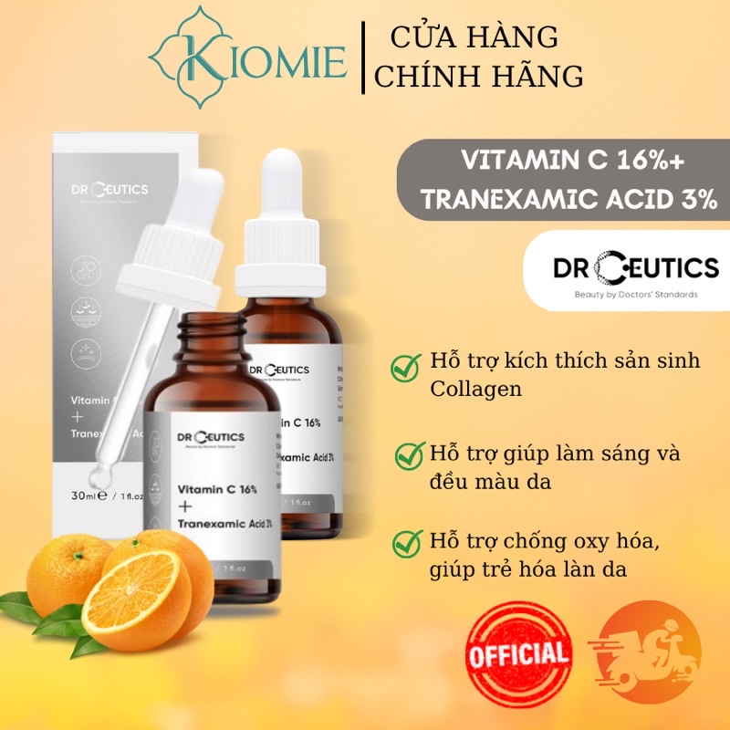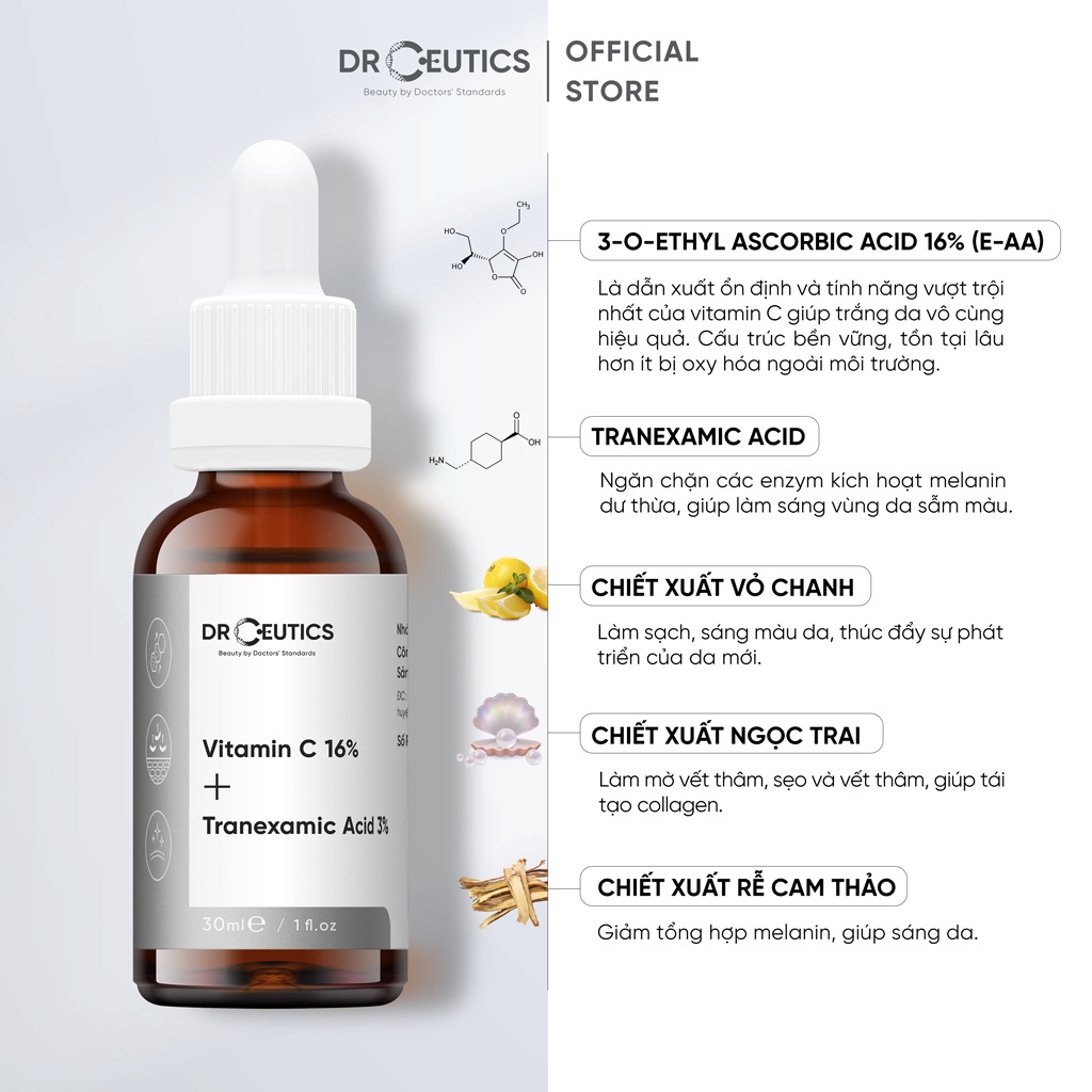Serum DrCeutics Ngăn Ngừa Lão Hóa Và Làm Sáng Da Chứa Vitamin C 16% Và Tranexamic Acid 3% • Thương hiệu: Dr Ceutics • Xuất xứ: Việt Nam Với 16% Vitamin C kết hợp cùng phức hợp Ferulic Acid + Vitamin E giúp bảo vệ da khỏi các gốc tự do gây lão hóa, giảm hình thành nếp