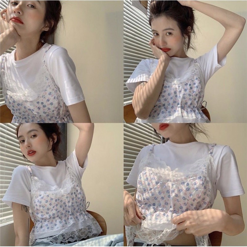 Set áo 2 dây hai dây hoa nhí croptop ren +áo thun áo phông
