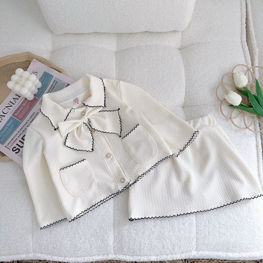 Set áo cổ nơ +CV Chữ A màu trắng kem siêu xinh cho bé gái