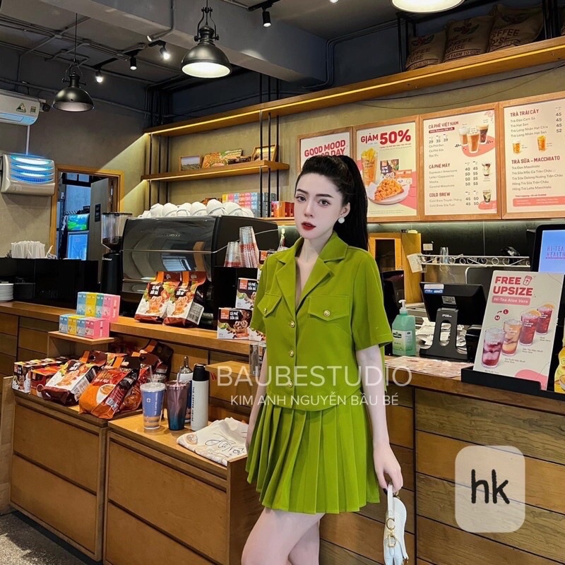 Set Áo Cổ Tơ Mix Chân Váy Xếp Ly 2 Màu