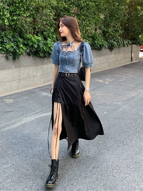 Set áo croptop bò LISA khoá ngực cổ vuông + chân váy đen thắt dây xẻ đùi Ulzzang cá tính sexy ❤️