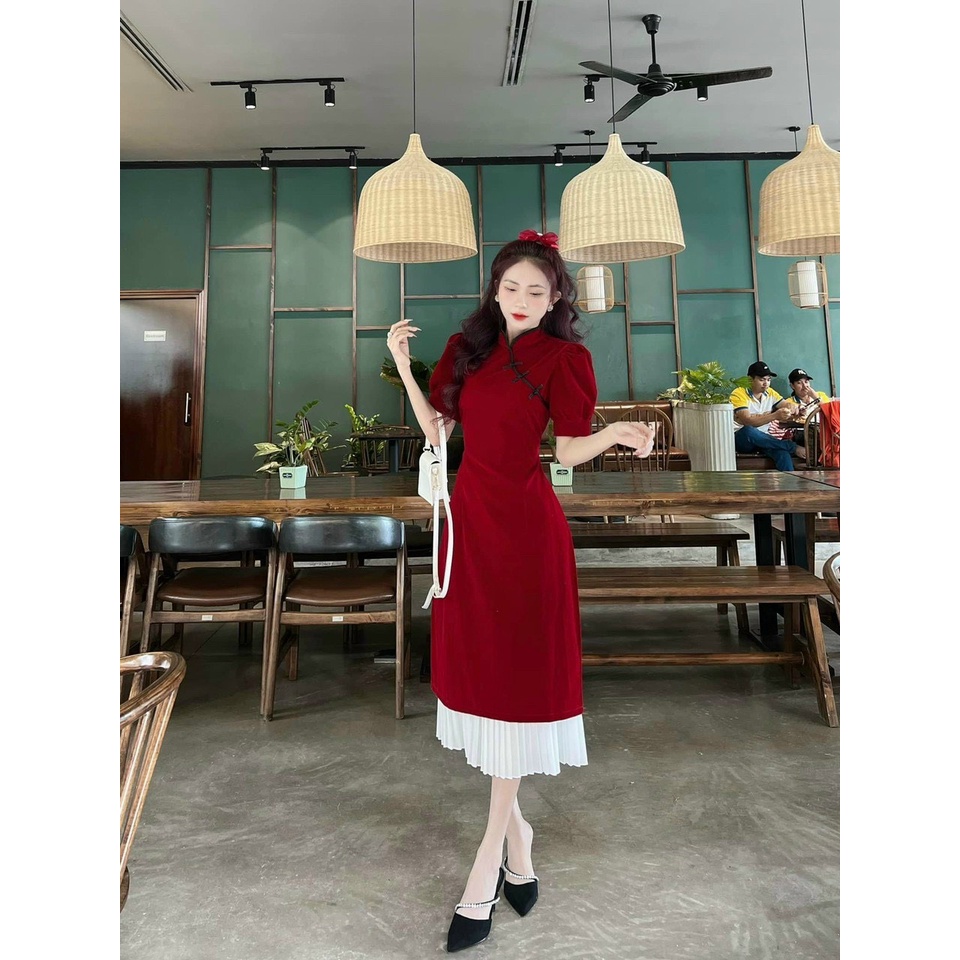 Set áo dài cách tân cổ tàu phối nút mây tay bồng mix chân váy dài dập ly xinh xắn thích hợp cho những buổi tiệc và tết