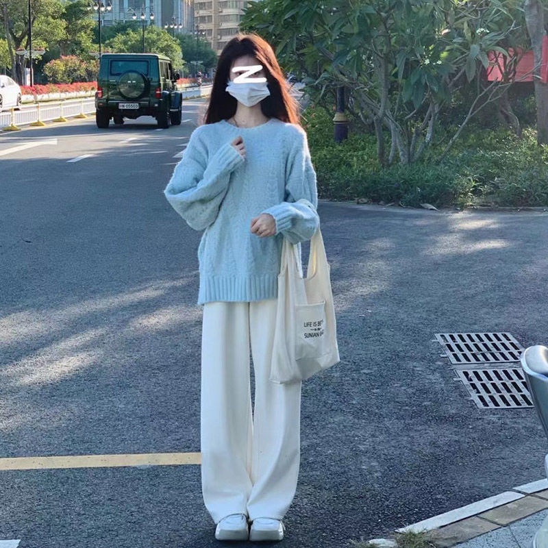Set Áo Sweater Dệt Kim + Quần Lưng Cao Ống Rộng Thiết Kế Mới Thời Trang Theo Phong Cách Hàn Quốc Cho Nữ