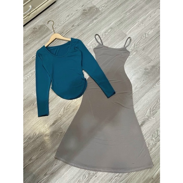 SET ÁO TAY DÀI VẠT BẦU KÈM VÁY HAI DÂY ĐUÔI CÁ DÁNG DÀI Chất liệu gân Size S M L.