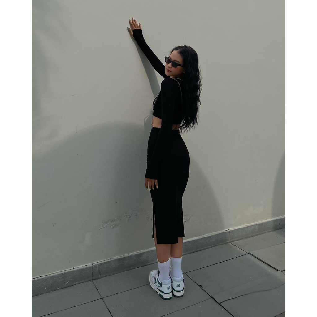 Set áo thun dài tay + chân váy bút chì dài đen chất thun ôm co dãn
