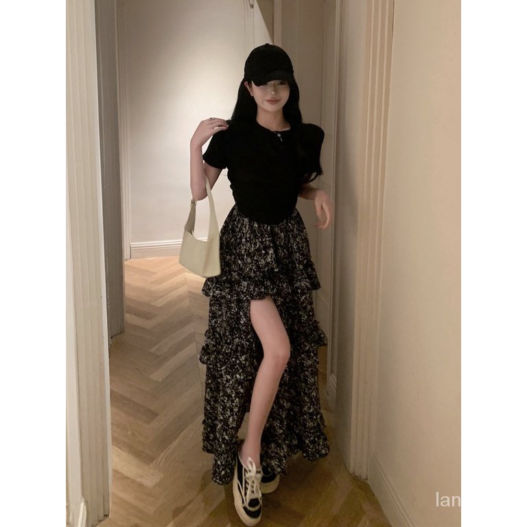 Set Áo Thun Ngắn Tay + Chân Váy Dài Xẻ Tà Họa Tiết Hoa Thời Trang Cho Nữ