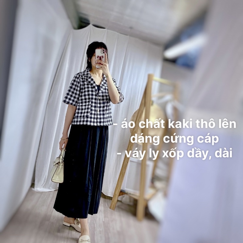 Set áo vest croptop kẻ caro mix chân váy dập li dài Áo crt kaki dáng véc