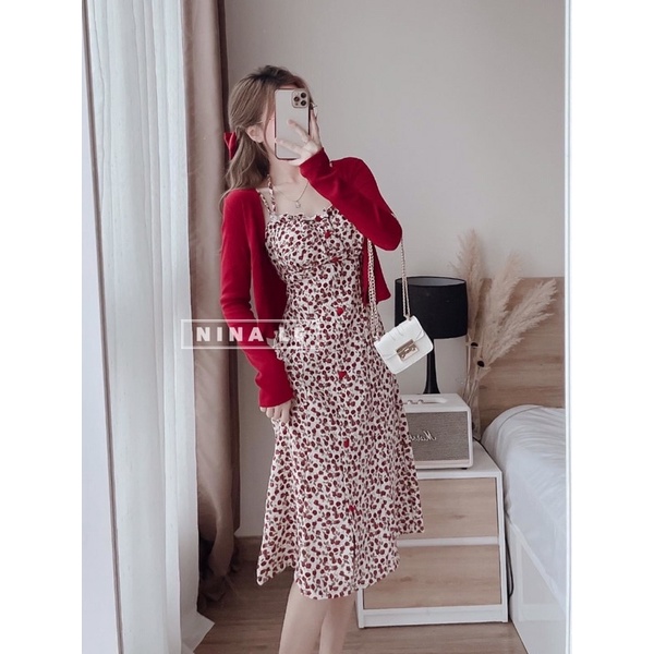 Set đầm nữ 2 dây hoa đỏ kèm áo khoác len tăm siêu cá tính diện tết đi chơi hay đi làm đều xinh