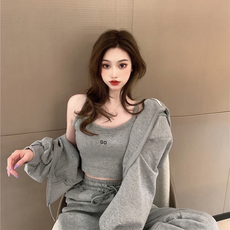 Set đồ 3 món gồm áo khoác + quần + áo hai dây phong cách thể thao trẻ trung cho nữ