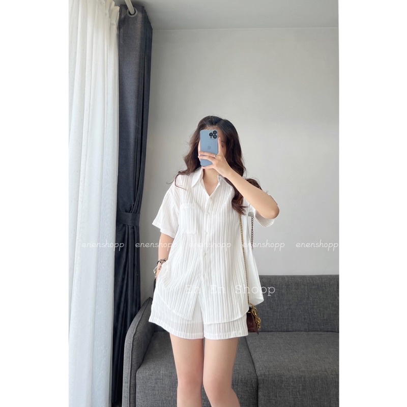 Set đồ nữ bộ đồ áo sơ mi cộc tay bèo thêu hoa kèm quần short nâu chất đũi siêu mát