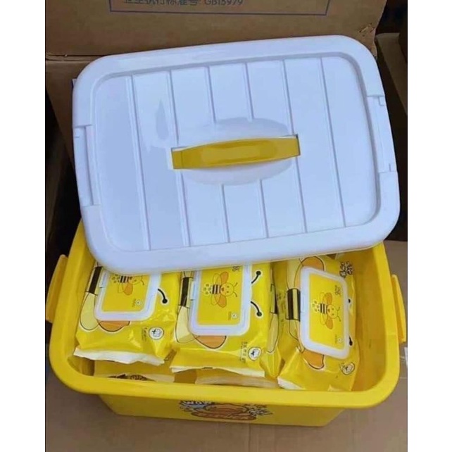 Set 1 thùng 10 hộp khăn giấy ướt tặng kèm theo thùng nhựa đựng như hình