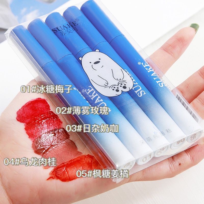 Set 5 son kem lì Suake Gấu 💰💰💰 Có sẵn ✨Set gồm 5 cây son kem với đủ các tone màu từ sắc đỏ đến sắc cam, đều là những tone màu được các nàng săn đón nhất, hot trend nhất trong năm. ✨Chất son mềm mượt, đặc biệt giữ màu lâu lên đến 4h đồng hồ mà không làm nặng môi hay lộ vân môi. ✨Đầu cọ son nhỏ, mảnh & dài giúp bạn thoa