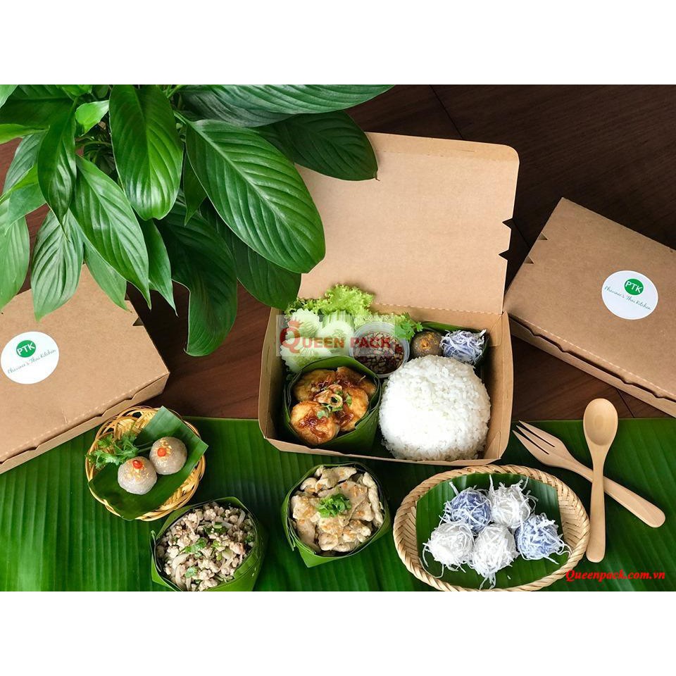 Hộp giấy kraft đựng thức ăn dùng 1 lần Sản phẩm được sản xuất từ giấy kraft, đã được dập nhiệt hoàn thiện, khách hàng mua hàng về là có thể sử dụng luôn. Bao bì giấy đựng thực phẩm được Queen Pack sử dụng 100% nguyên liệu nguyên sinh, Sản phẩm Hộp cơm giấy an toàn cho