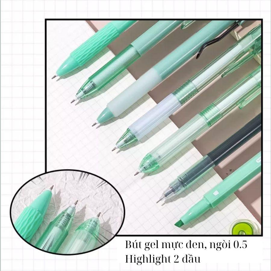 1 set gồm 7 bút với các thiết kế độc đáo khác nhau. Trong đó có 6 bút gel mực đen ngòi 0.5 và 1 bút highlight 2 đầu (1 đầu highlight và 1 đầu bút dạ kim) Có 6 tông màu đa dạng để lựa chọn: • Xanh mint • Xanh bubble • Xám khói • Đỏ • Vàng • Tím • Xanh dương Bút Mok