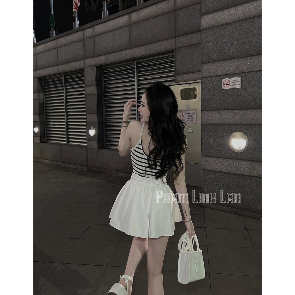 Set Bộ Đồ Nữ Áo 2s Dây Kẻ Gạo Đen Trắng Cúc Ngực Ôm Body Mix Quần Sooc Đùi Ống Rộng Giả Váy Freesize