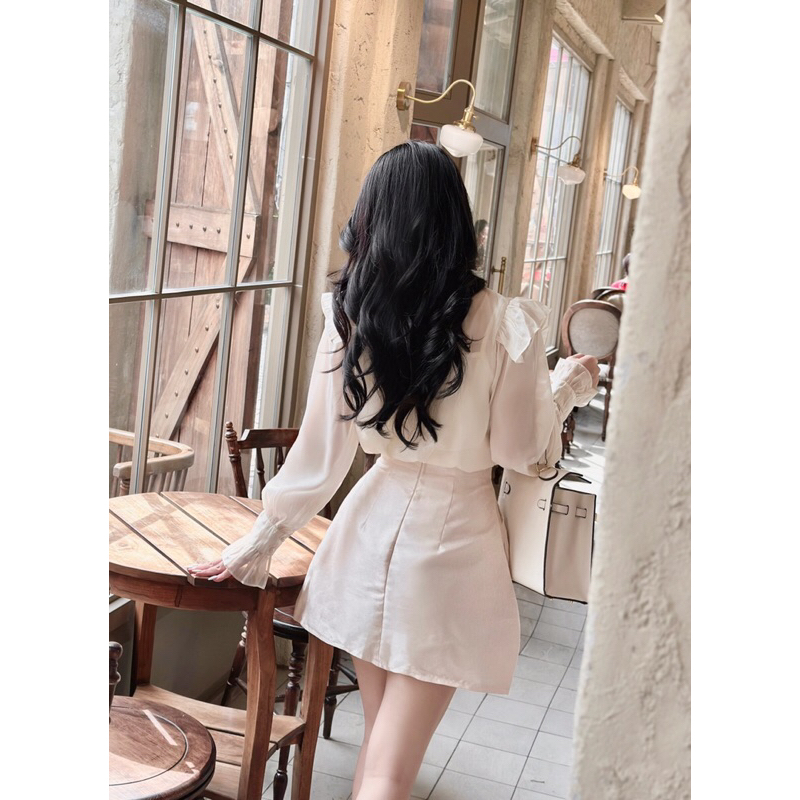 Set nude áo voan tơ cổ bèo nút + chân váy laser