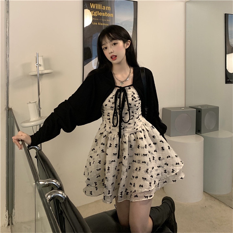 Set trang phục ZHELIHANGFEI đầm hai dây họa tiết hoa và áo khoác cardigan dệt kim dáng ngắn thời trang cho nữ