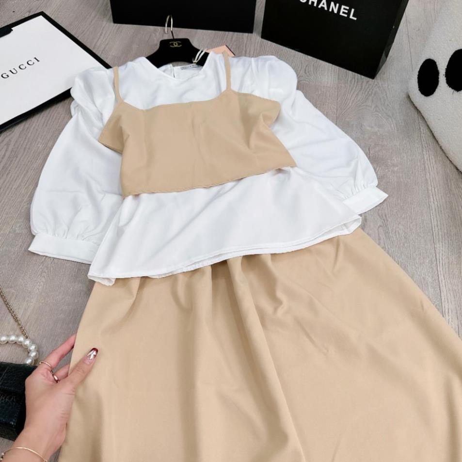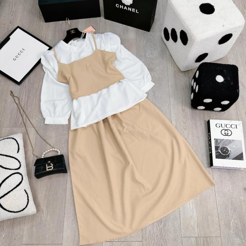 Set Váy Nữ 3 Món Áo Yếm 2 Dây Đan Lưng Phối Áo Sơ Mi Cổ Tròn Dài Tay Mix Chân Váy Dáng Dài Freesize