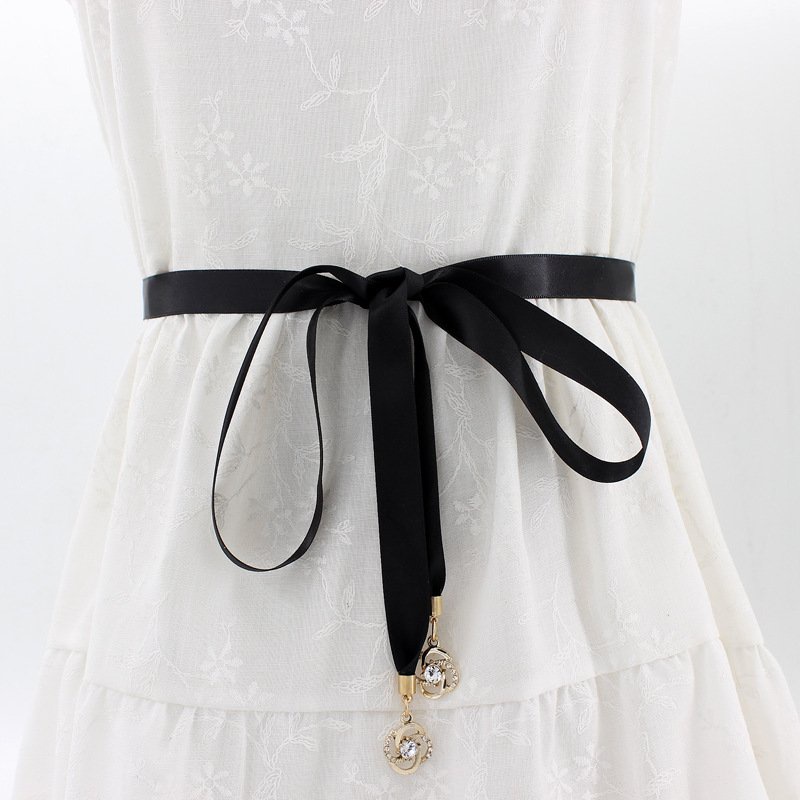 Đai váy vải ren gắn hạt ngọc đen, dây thắt lưng vải ngọc đính đá bản 2,3cm