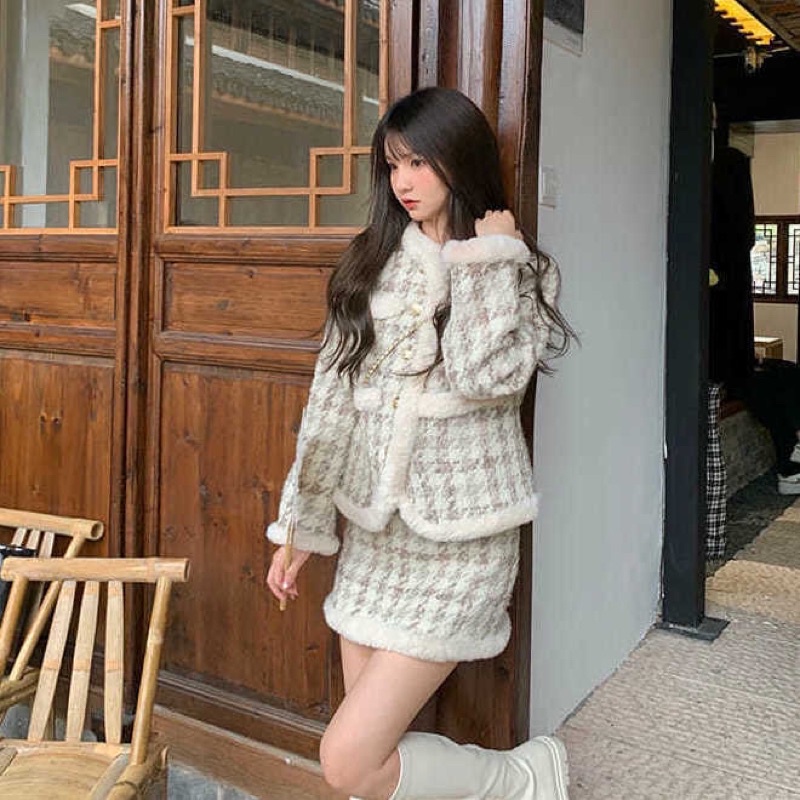 Set Váy dạ Tweet, set áo khoác kẻ caro kèm váy màu nâu in viền nổi bên trong lót bông phong cách hongkong