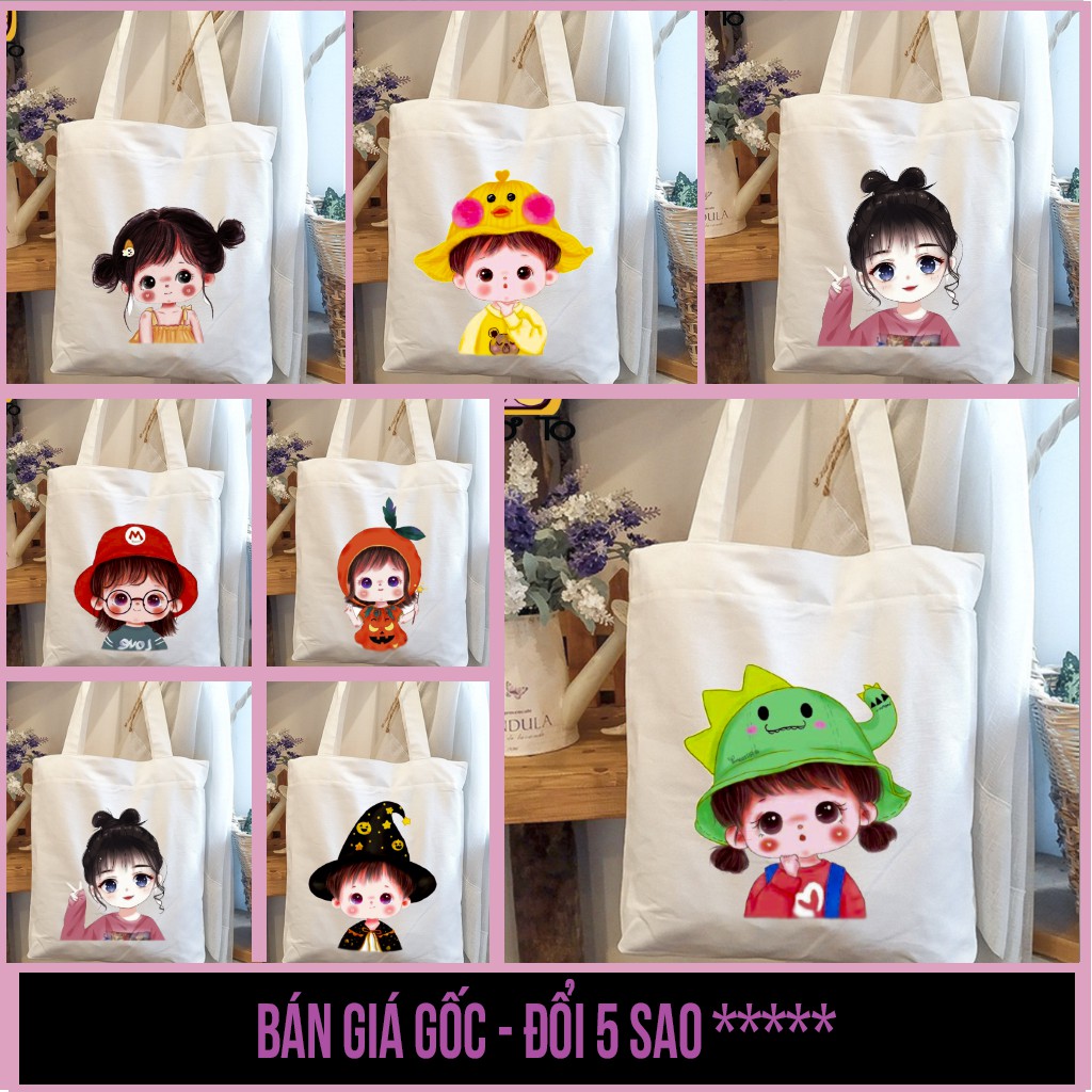 Túi tote VUÔNG in hình cô bé cậu bé TỔNG HỢP túi vải túi canvas quai tròn có khóa kéo - Túi Mơ to store
