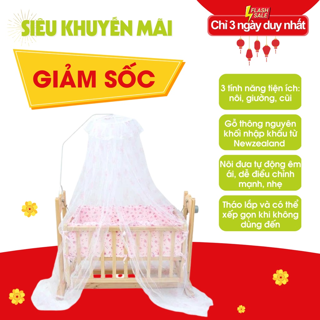 Nôi Gỗ Thông Tự Động Màu Tự Nhiên 3Trong 1 Cho Bé VINANOI VNN201TN