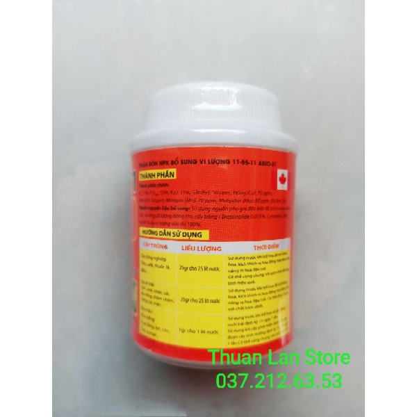 Siêu Lân 11-55-11 Phần Lan 100gr Phân bón NPK bổ sung vi lượng 11-55-11 Abio-31 - Thành phần: + Thành phần chính: Nts: 11%; P2O5hh: 55%; K2O: 11%; Sắt (Fe): 50ppm; Đồng (Cu): 70ppm; Kẽm (Zn): 50ppm; Mangan (Mn): 70ppm; Molipden (Mo): 50ppm; Độ ẩm: 5% + Nguồn nguyên