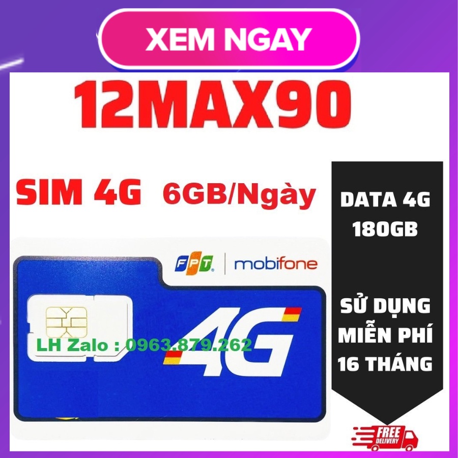 Sim data 4G khủng 12MAX90 có 180GB/tháng tương đương 6GB/ngày - Sim sử dụng trọn gói 16 tháng