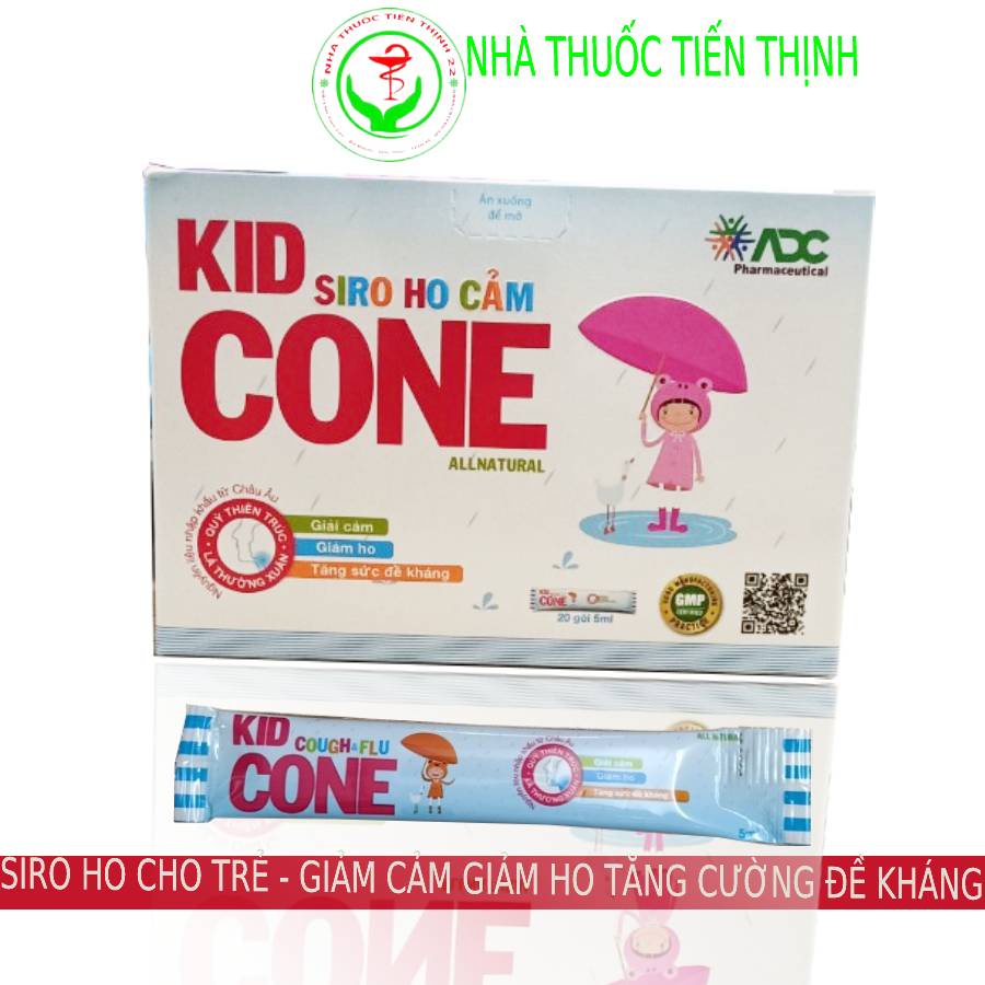 Siro ho cho trẻ Kid Cone tiêu đờm, giải cảm tăng cường đề kháng dạng gói_Hộp 20 gói Thành phần mỗi gói 5 ml chưa: - Chiết xuất lá thường xuân.........30mg - Chiết xuất Quỳ Thiên Trúc.........20mg - Chiế xuất Kinh Giới....................20 mg - Dịch chiết củ Gừng ...................20mg - Trần bì........................................10mg - VitaminC ....................................50mg - Kẽm Gluconat.............................10mg - Đường trắng nước tinh khiết.......5mg Công dụng: - Hỗ trợ giảm các triệu chứng cảm cúm như hắc hơi, sổ mũi, ho, đau họng. - Bổ sung vitaminC giúp giải cảm, tăng sức đề kháng cho cơ thể. Đối tượng sử dụng: - Người lớn và trẻ em bị cảm cúm, cảm lạnh, ho gió ho khan, do dị ứng thời tiết, người có đề kháng kém. Hướng dẫn sử dụng: - Trẻ em từ 1-3 tuổi: 5ml (1goi) x 2-3 lần/ ngày - Trẻ em từ 3-6 tuổi: 5ml (1goi) x 3-4 lần / ngày - Người lớn và trẻ em trên 6 tuổi: 10ml (2goi) x 3-4 lần/ ngày Bảo quản nơi khô ráo. Tránh ánh sáng trực tiếp Tiêu chuẩn:TCCS Nhà máy đạt:GMP * Chú ý : Để xa tầm tay trẻ em - đọc kỷ hướng dẫn trước khi sử dụng - Sản phẩm này không phải là thuốc và không có tác dụng thay thế thuốc chữa bệnh. TN chịu trách nhiệm SP: Cty TNHH ADC #sirotreem #siroho #sirocamtreem #sironguoilon #hokhang #camcum