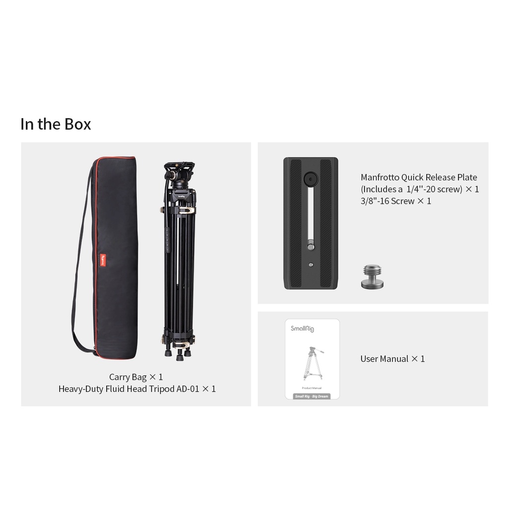 SmallRig Heavy-Duty Fluid Head Tripod AD-01 code 3751 ! Mẫu Tripod chuyên dụng cho máy quay, camera như Sony, Canon, Nikon chuyên quay với khả năng chịu tải cao, thiết kế trục pan, tilt xoay nhẹ nhàng cho chuyển cảnh movement mượt khi quay. Trọng lượng 4kg chịu tải dư