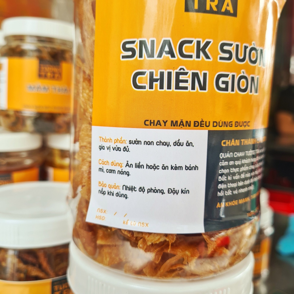 Dalo 0981684521 - 0902353503 (Ngân) [Thực phẩm chay ăn liền] SNACK SƯỜN CHIÊN GIÒN 150gr SNACK SƯỜN CHIÊN GIÒN, hương vị đặc biệt thơm ngon, giòn mặn gây nghiện, ăn như snack hoặc ăn với cơm nóng, bánh mì. - Thành phần: Đậu nành, bột khoai, gia vị vừa đủ - Trọng lượng: 150gram/hủ - Hạn sử dụng: 1 tháng - Hướng dẫn sử dụng: Ăn như snack hoặc ăn kèm với cơm nóng, bún tươi, bánh mì. - Hướng dẫn bảo quản: Nhiệt độ phòng (nơi thoáng mát, tránh ánh nắng trực tiếp). Đậy kín nắp sau khi dùng, tránh không khí vào sẽ mềm. Các sản phẩm BÁN CHẠY khác: - thịt kho tiêu chay - nấm đông cô kho mặn - dừa non kho tiêu - tương hột kho xả - nước mắm kho chay... --------------------------------------------------- CAM KẾT - Nguyên liệu sạch thuần chay với nguồn đạm đậu nành dồi dào - Quy trình sản xuất khép kín, đảm bảo đạt chuẩn an toàn vệ sinh thực phẩm. - Hỗ trợ đổi trả hàng hóa nếu có lỗi từ NSX. --------------------------------------------------- * Tại sao nên lựa chọn THỰC PHẨM CHAY? - Mọi người thường nghĩ thực phẩm chay không nhiều giá trị dinh dưỡng. Tuy nhiên chúng vẫn cung cấp đầy đủ các chất dinh dưỡng cần thiết cho cơ thể, có giá trị tương tự như thịt bình thường, chỉ khác nhau về nguồn gốc. - Không chứa cholesterol, đạm động vật, chất béo - cực kỳ tốt cho người cao tuổi hoặc có bệnh nền. - Không nhiễm kháng sinh và hormone tăng trưởng, các chất độc hại như thịt động vật. * Tại sao nên lựa chọn TƯỜNG TRÀ? - Công thức gia truyền nhiều đời - Hương vị mẹ nấu rất dễ ăn và thơm ngon - Món ăn chế biến sẵn, bảo quản ngắn hạn, đảm bảo độ thuần của nguyên liệu TƯỜNG TRÀ tự tin mang đến sự thay thế hoàn hảo trong các bữa ăn hàng ngày của quý khách hàng. BẤT KÌ THẮC MẮC HAY YÊU CẦU NÀO, HÃY NHẮN TIN CHO CHÚNG TÔI 0981684521 - 0902353503 (Ngân) #thucphamchay #thuanchay #chay #anchay #anvat #anlien #thucphamkho #donghop #dohop #thucpham #doan #nhuyeupham #chebiensan #anlien #daunanh #damdaunanh #suonnonchay #tuonghotchay #eatclean #healthy #suckhoe #duamam #snacksuon