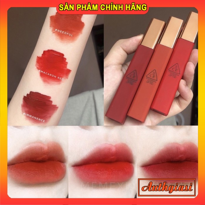 Son kem lì siêu hot 3CE Cloud Lip Tint mềm mịn và lâu trôi Xuất xứ: Hàn Quốc Hãng sản xuất: 3CE 1. Mô tả: Mùa hè sôi động, không ngừng khám phá và tìm tòi luôn là dịp để giới trẻ thỏa sức tung hoành. Nắm bắt được tâm lý này, nhân dịp hè 2019, hãng STYLENANDA đã cho ra đời Siêu Phẩm Son mới toanh, mới xình xịch. Sản phẩm cải tiến từ bao bì đến chất son và mong muốn mở ra khung trời cho chất son cũng như màu son mĩ mều. Thiết kế bao bì sản phẩm Son Kem Lì "Siêu Hot" 3CE Cloud Lip Tint: + Vỏ son bằng nhung mịn, khi chạm vào vỏ son là ngay lập tức cảm nhận được sự đầu tư của hãng STYLENANDA. Thân son sờ rất đã và có phủ một lớp kim tuyến nhẹ, lấp lánh và đắt tiền. + Chưa hết màu vỏ son tương đồng với màu son bên trong gần như tuyệt đối. Chẳng những dễ dàng tiện lợi cho người sử dụng mà còn khiến cho mỗi sản phẩm là một tuyệt tác riêng biệt. + Nắp vỏ bằng kim loại ánh màu vàng đồng cực sang. Mỗi lần thoa son ở chỗ đông người, bạn sẽ cực kì tự hào và tự tin vì thân son quá đẹp! + Thiết kế cọ tô son bên trong: Drip Applicator Cloud lip Tint. Đầu cọ son môi thiết kế hình giọt nước cho cảm giác tô son thật độc đáo. Quan trọng nhất là công cụ tuyệt vời hỗ trợ tối đa bạn gái cho đường viền môi chính xác và đôi môi đầy đặn, căng mọng. 2. Công dụng chính:. - Son Kem Lì 3CE Cloud Lip Tint có kết cấu nhẹ như mây. Cho bạn trải nghiệm " Walking in the cloud", nhẹ như mây hồng, . Chất son kem mềm mại sẽ khô lại nhưng không khô lì mà mềm mại trơn mịn. Chất son dễ dàng tán đều và bám chặt vào môi như lớp da thứ hai. Từ đó hạn chế việc lem son, vấy bẩn son và duy trì hiệu ứng che mờ rãnh môi, vân môi. Cho bạn đôi môi như mây như mơ. - Lớp son kết thúc mờ ảo che mờ các khuyết điểm trên môi. Như thể bờ mặt được "cà" láng mịn như đã qua lớp Photoshop Filter. Chất son tạo nền trang điểm môi mịn màng như tấm màn nhung. Màu sắc sống động, mạnh mẽ ôm lấy đôi môi và bền màu. Sắc son tint sẽ vẫn lưu lại một lớp màu nhẹ nhàng dù bạn đã qua ăn uống hay chạm nước. - Cọ son hình giọt nước hỗ trợ tối đa trong việc thoa son chính xác và dịu dàng với làn da môi nhạy cảm. 3. Phân loại: #Beige Avenue #Needful #Active Lady #Peach Tease #Live A Little #Cutesicle #Blosssom Day #Pinkalicious #Carrot Pink #Fairy Cake #Immanence #Macaron Red