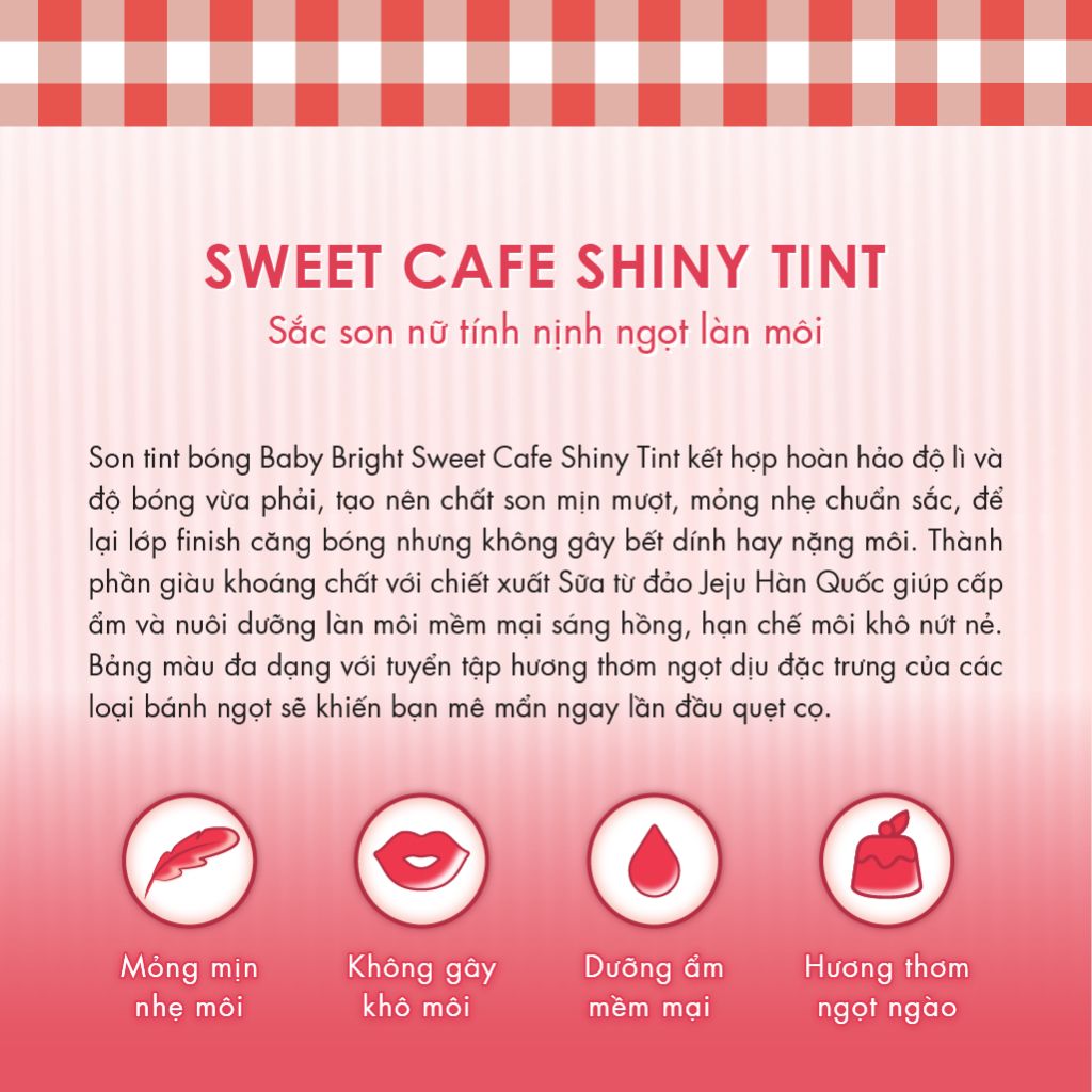 Son tint bóng mịn mượt, mỏng nhẹ chuẩn sắc, để lại lớp finish căng bóng nhưng không gây bết dính hay nặng môi. Thành phần chứa chiết xuất Sữa từ đảo Jeju Hàn Quốc giúp cấp ẩm và dưỡng môi mềm mại. Bảng màu đa dạng ngọt ngào xinh yêu LỰA CHỌN HOÀN HẢO #01 Cat Cafe: Màu hồng dâu trong trẻo #02 Carrot Cake: Màu cam cà rốt tươi tắn #03 Strawberry Tart: Màu đỏ dâu ngọt ngào quyến rũ #04 Berry Macaron: Màu đỏ berry chín mọng #08 Coffee Latte: Màu cam sữa trendy #09 Brown Sugar: Màu nâu đất sang chảnh kiêu kì Tên Công ty: CÔNG TY TNHH KARMARTS VIỆT NAM Địa chỉ Công ty: Bluesky Tower, Tầng 04, số 01, Đường Bạch Đằng, Phường 2, Quận Tân Bình, Thành phố Hồ Chí Minh, Việt Nam Xuất xứ: Thái Lan Nơi sản xuất : Thái Lan Ngày sản xuất: Xem trên bao bì Hạn sử dụng 3 năm kể từ ngày sản xuất THÔNG TIN THƯƠNG HIỆU BABY BRIGHT là thương hiệu mỹ phẩm Hàn Quốc do công ty Karmart thành lập, và có nhà máy sản xuất tại Thái Lan. Các dòng sản phẩm phục vụ nhu cầu làm đẹp từ đầu đến chân của phụ nữ gồm trang điểm, chăm sóc da mặt và cơ thể, chăm sóc tóc, kem dưỡng tay và phụ kiện trang điểm. Tất cả sản phẩm của Cathy Doll được sáng tạo để cho hiệu quả làm đẹp tức thì và an toàn cao nhất cho người sử dụng.