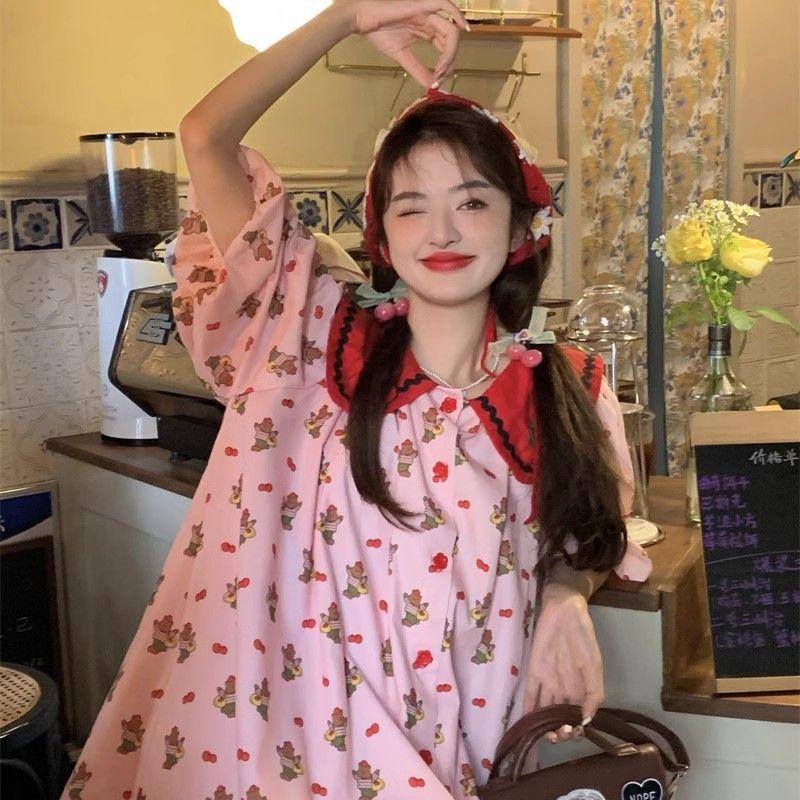 CHENGRUI Triệu Lộ Tư ngôi sao cùng màu hồng hoa đầm búp bê nữ cổ áo mùa hè ngắn tay váy ngọt ngào công chúa váy ẩm ướt