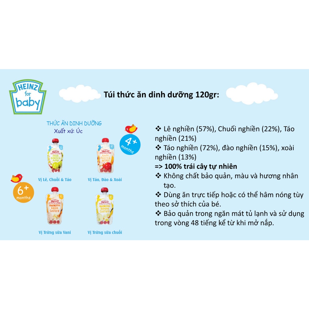 - Túi Chuối, Lê & Yến mạch Heinz là thức ăn dặm được chế biến sẵn dành cho bé từ 8 tháng tuổi - Cung cấp dinh dưỡng cho trẻ phát triển toàn diện - Chứa các nguyên tố vi lượng, giàu chất xơ, tốt cho hệ tiêu hóa - Giúp cho trẻ làm quen với các thức ăn đa dạng ngoài sữa