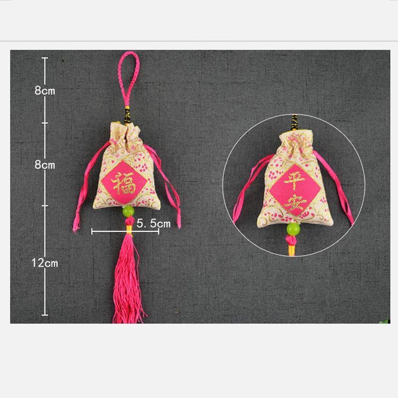 - Tên sản phẩm: Túi gấm thơm cầu bình an, phước lành - Chất liệu: Vải gấm + Dây tua rua - Bộ sản phẩm: Túi vải + Ruột túi - Kích thước (Dài x Rộng): 5,5 x 8cm - Túi gấm thêu chữ 2 mặt túi là chữ phước và bình an, có ý nghĩa may mắn. Người sử dụng sẽ nhận được nhiều phước lành nếu mang túi trong người. - Túi có thể treo trên xe ô tô, làm móc chìa khóa, treo tủ quần áo,... Túi có thể làm quà tặng lưu niệm tặng bạn bè. - Màu sắc: Đỏ, Hồng đậm, Hồng nhạt, Xanh lá cây, Xanh dương, Tím, Vàng